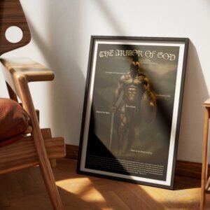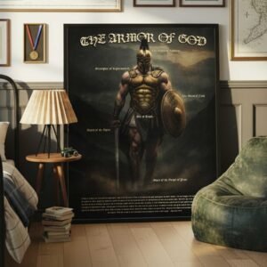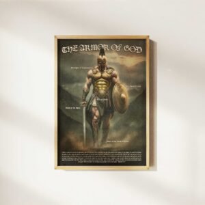 This striking digital print of a Roman warrior clad in “The Armor of God” — complete with labels for the Helmet of Salvation, Shield of Faith, Belt of truth, Sword of the Spirit, Breastplate of Righteousness, and Shoes of the Gospel of Peace — transforms any room. Perfect for refreshing a son’s bedroom, elevating a husband’s office, or adding depth to a pastor’s study, this artwork not only captures the spirit of Ephesians 6:10–18 but also reshapes the atmosphere with courage and faith. A meaningful Christian gift for Father’s Day, birthdays, or simply to enrich a room with spiritual strength.