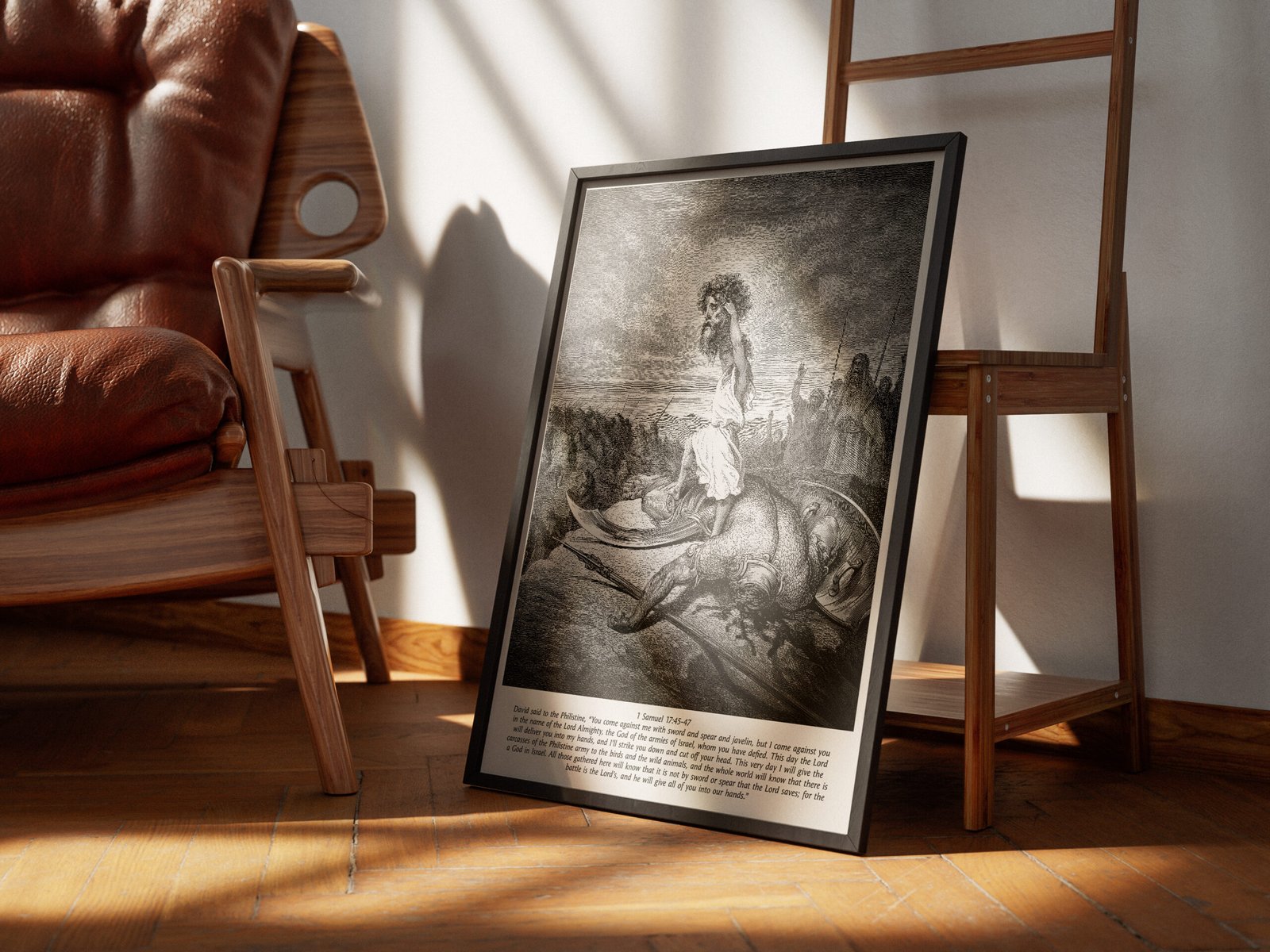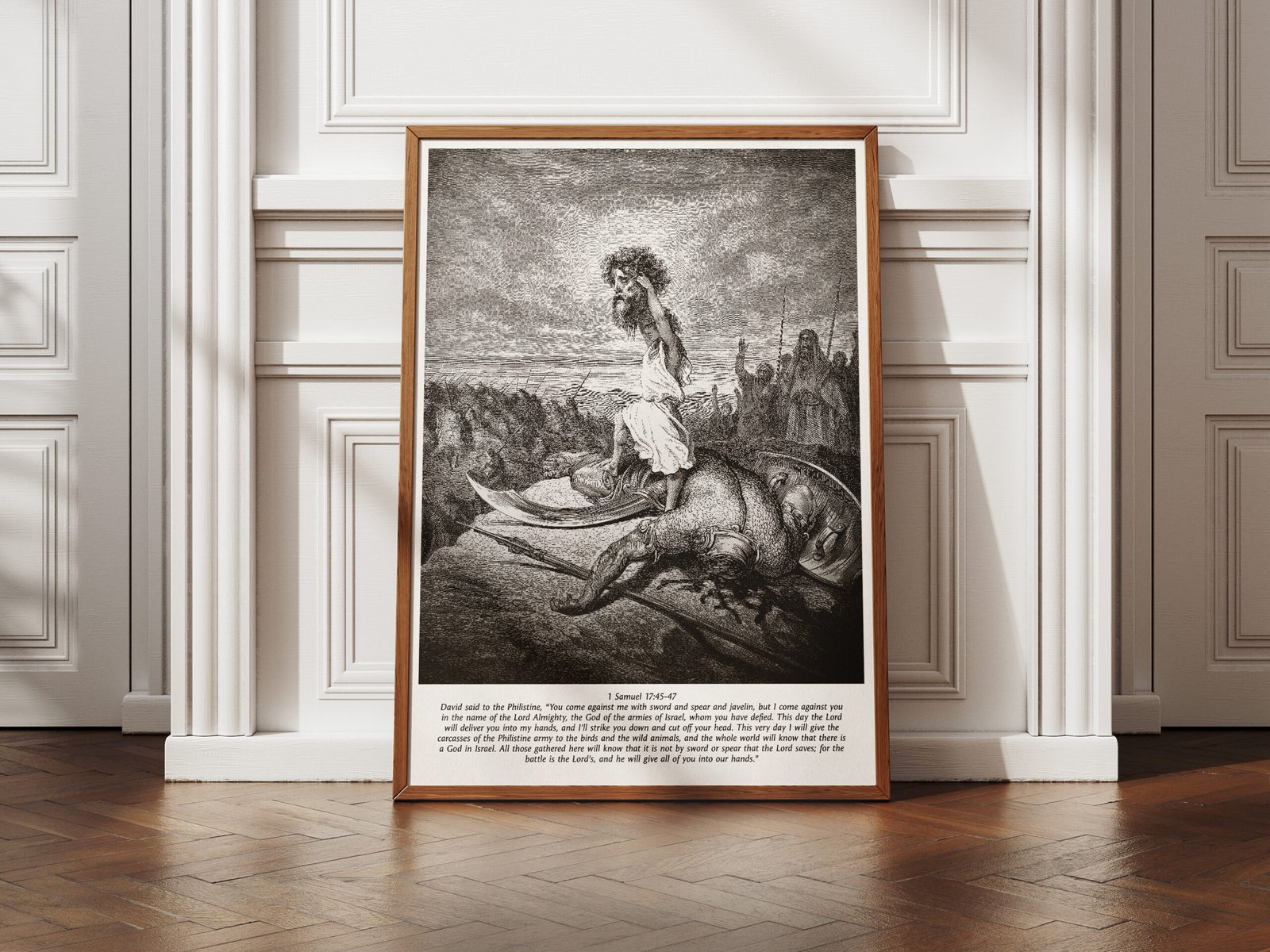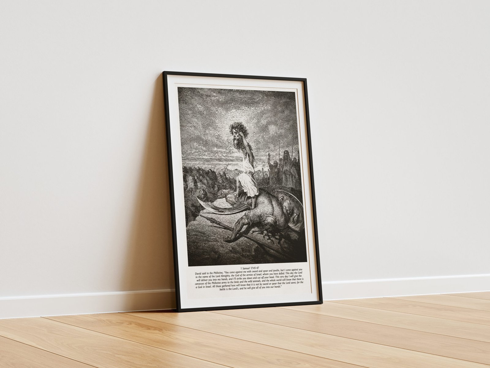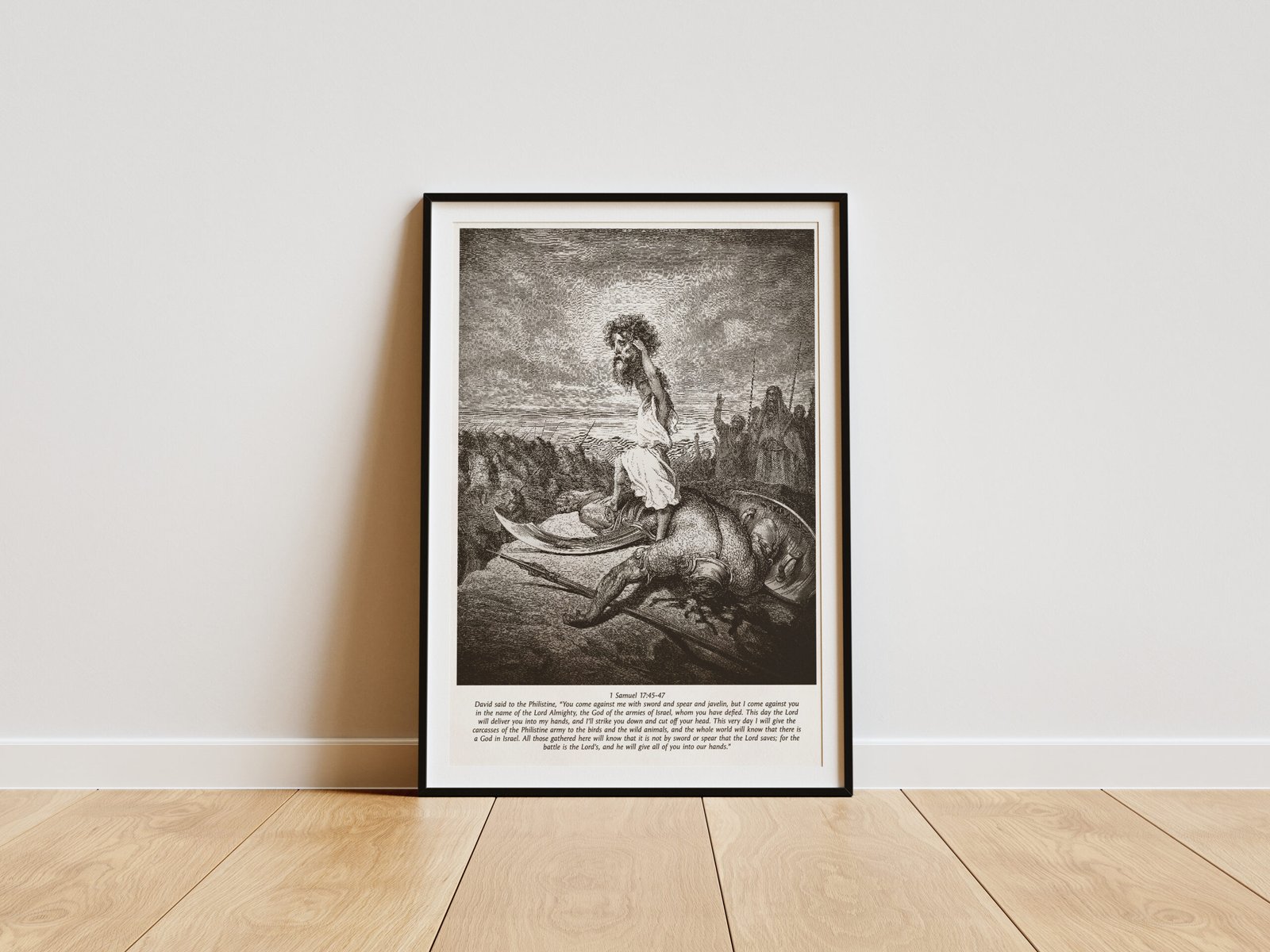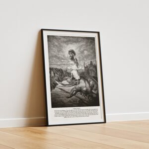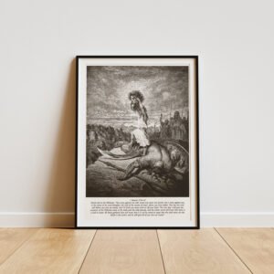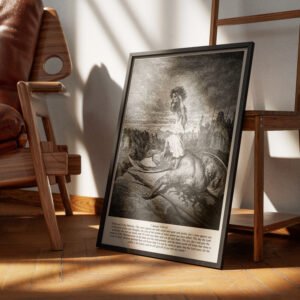 This striking black-and-white print of David standing over the fallen Goliath is a visual reminder of the time when faith conquerd all odds. Gustave Doré’s masterful 19th-century engraving breathes life into one of the most powerful moments in biblical history, where God’s chosen warrior prevails over an enemy of overwhelming strength. Perfect for pastors, fathers, and men of faith, this artwork makes a bold statement of divine courage, masculine strength, and unwavering trust in the Lord.