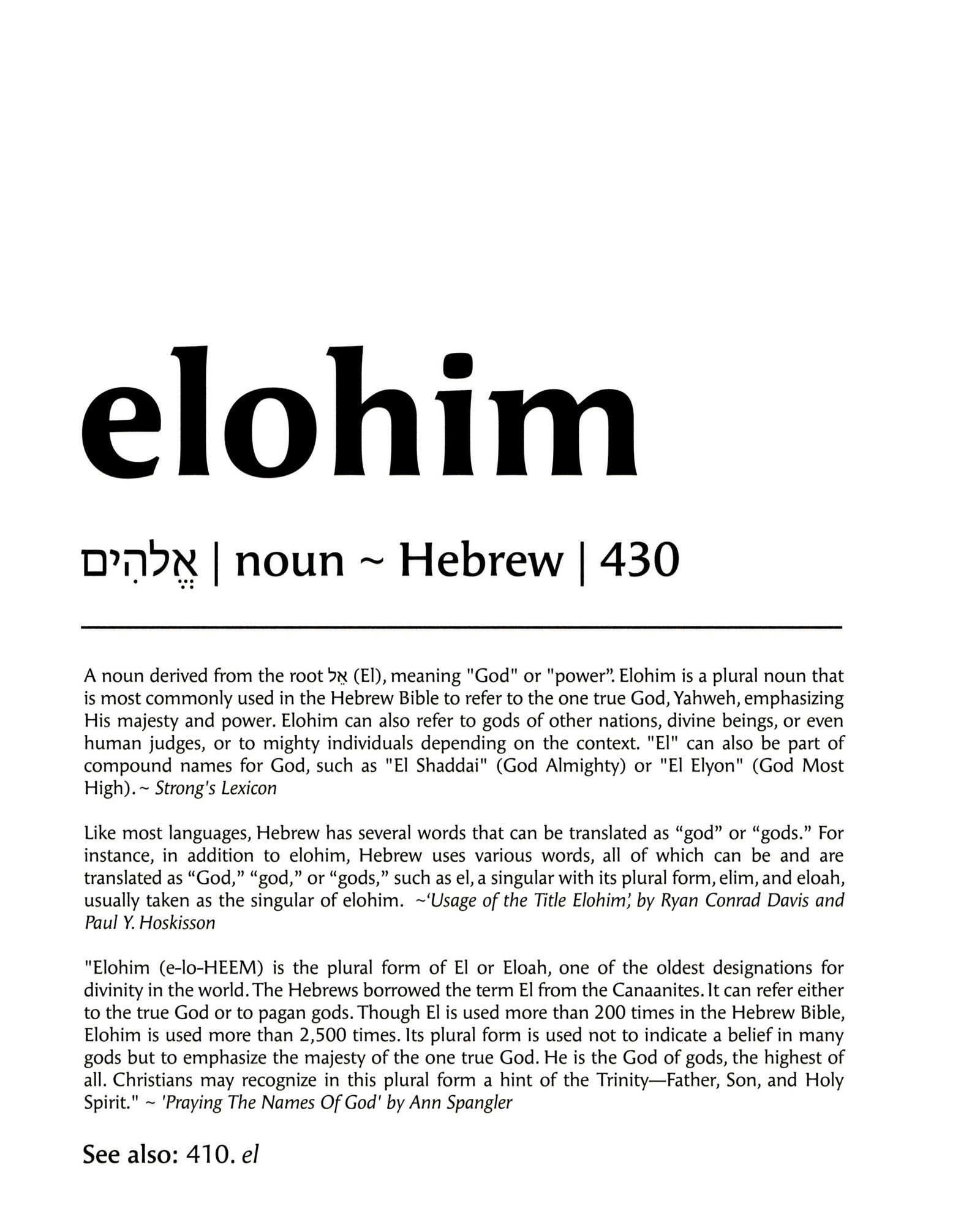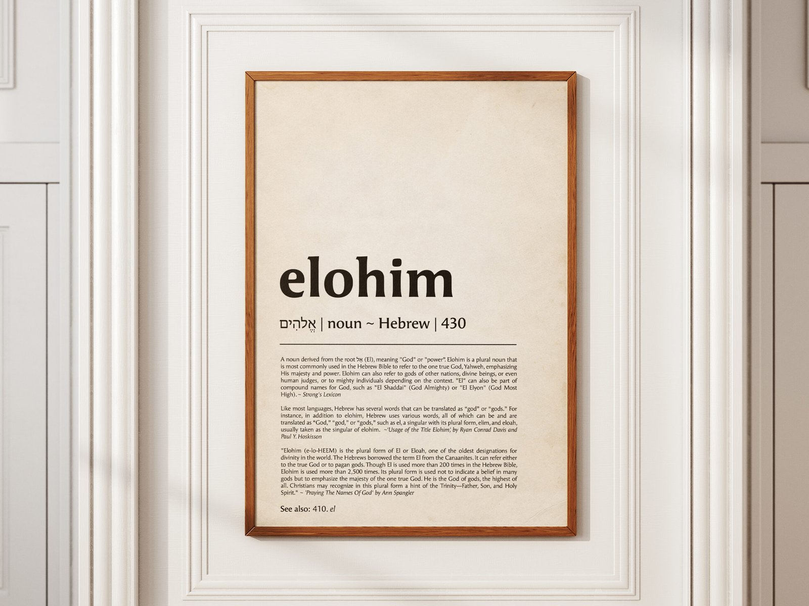 Delve into the profound meaning of Elohim with this dictionary-style art print, crafted with excerpts from established biblical sources. Choose your preferred presentation—clean white for contemporary flair or vintage paper for nostalgic charm. This work of art is designed to inspire and inform, a thoughtful expression of faith designed to resonate in homes, study rooms, and pastoral offices.