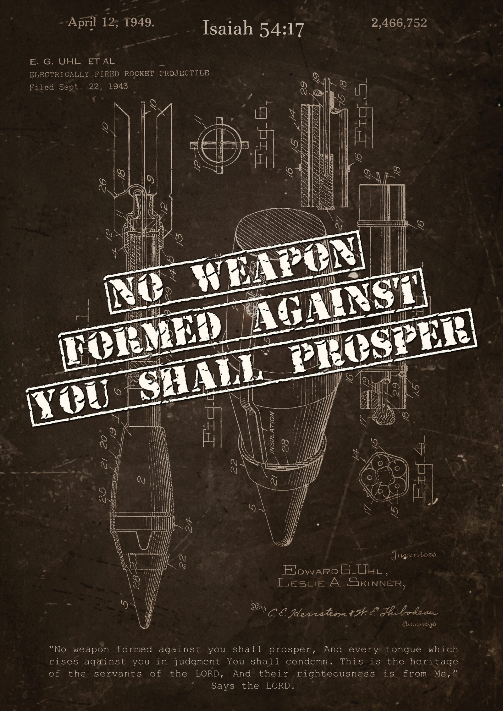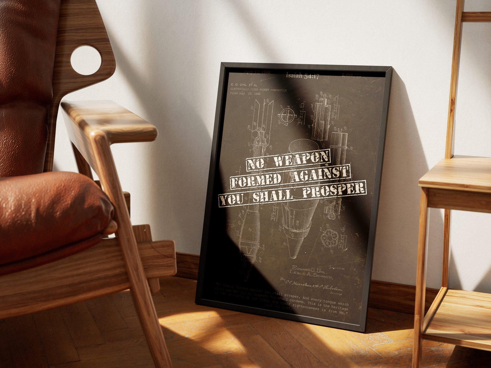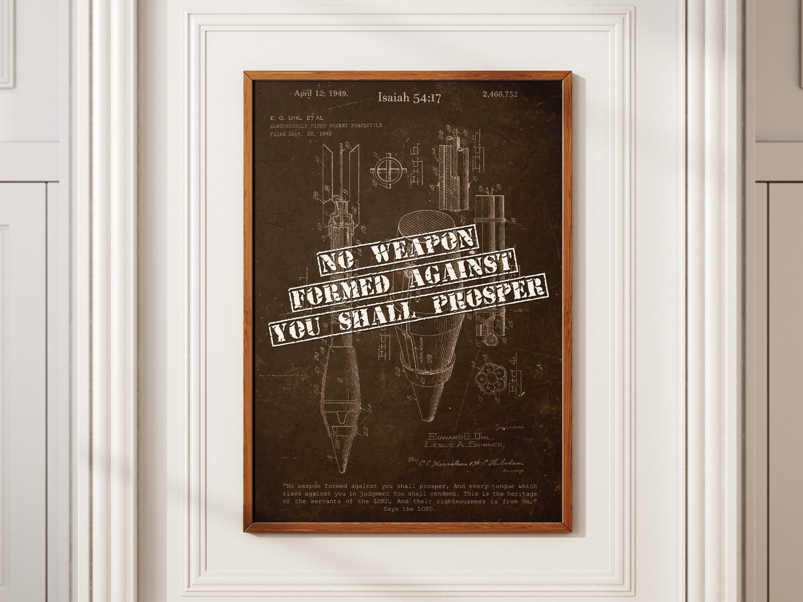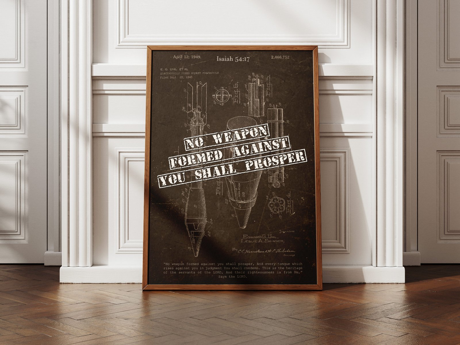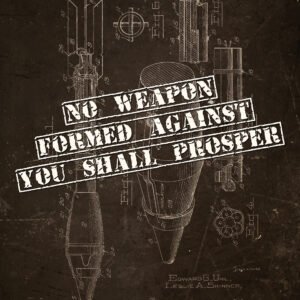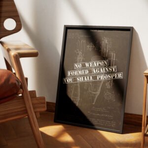This vintage-inspired rocket launcher patent print combines rugged, industrial design with the powerful message of Isaiah 54:17: “No weapon formed against you shall prosper.” Perfect for men’s offices, pastors, or Christian homes with a bold and masculine aesthetic.
