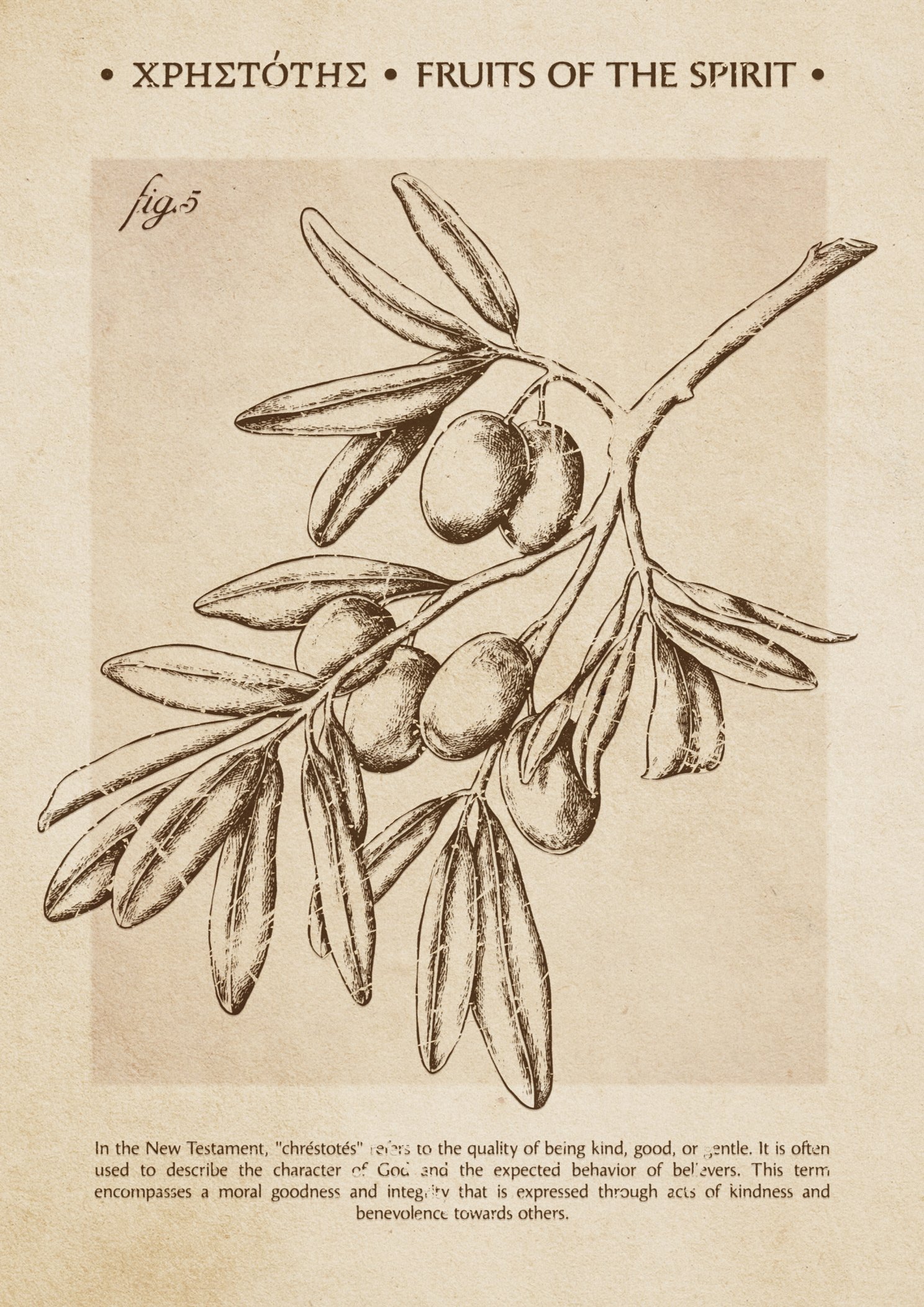 This vintage-style fruit illustration art print incorporates the Greek word for Kindness (chrēstotēs) from Galatians 5:22-23. Celebrate the Fruits of the Spirit with this beautiful digital print, its moody tones and spiritual message make it a standout piece for any Christian home or wall decor.