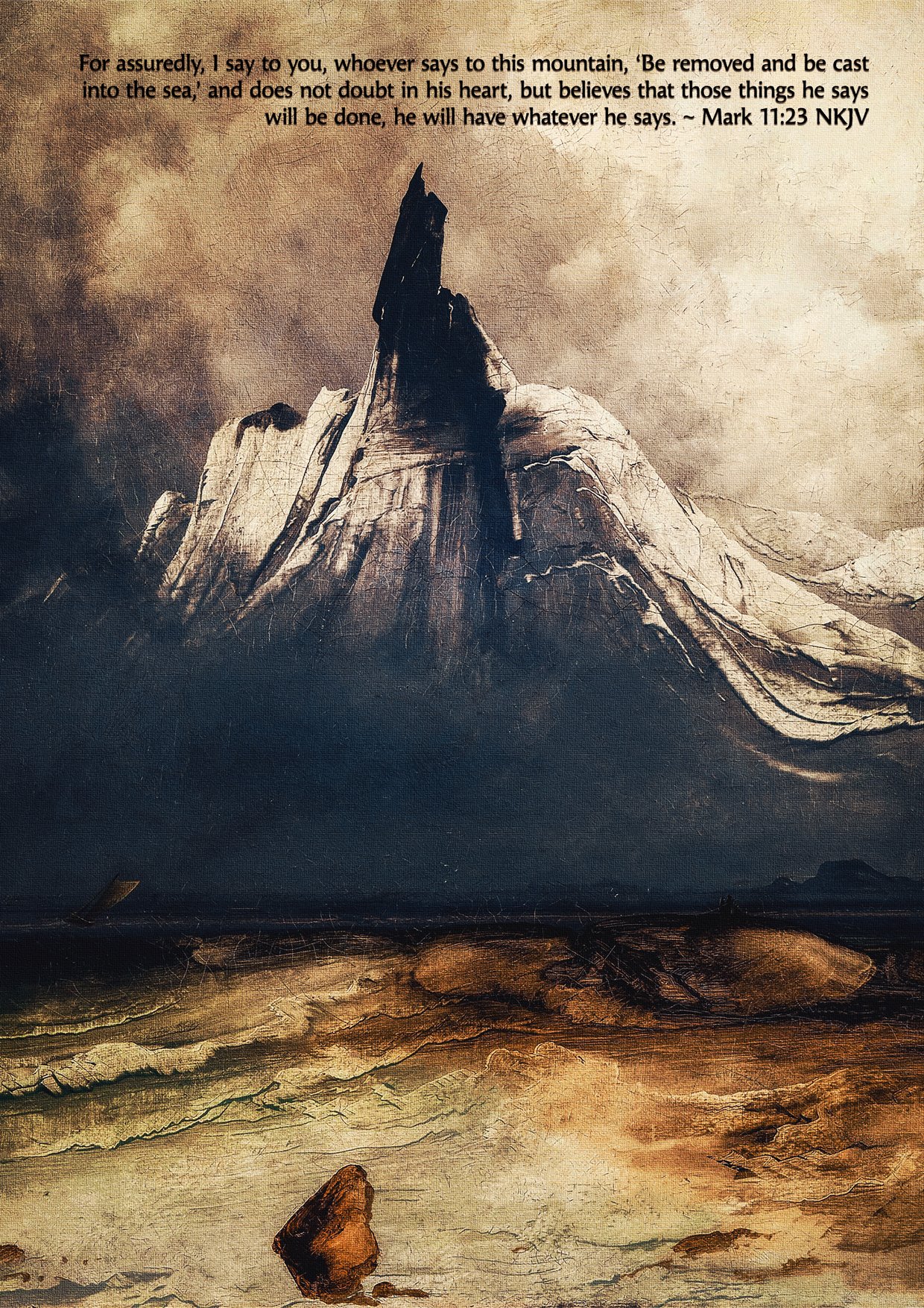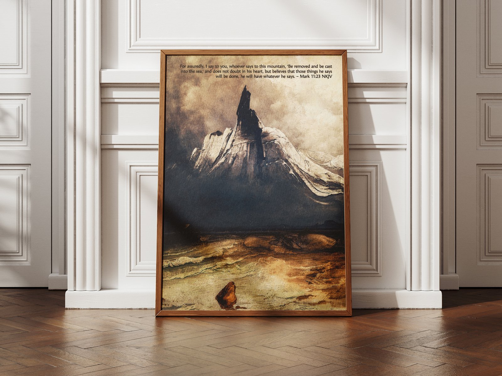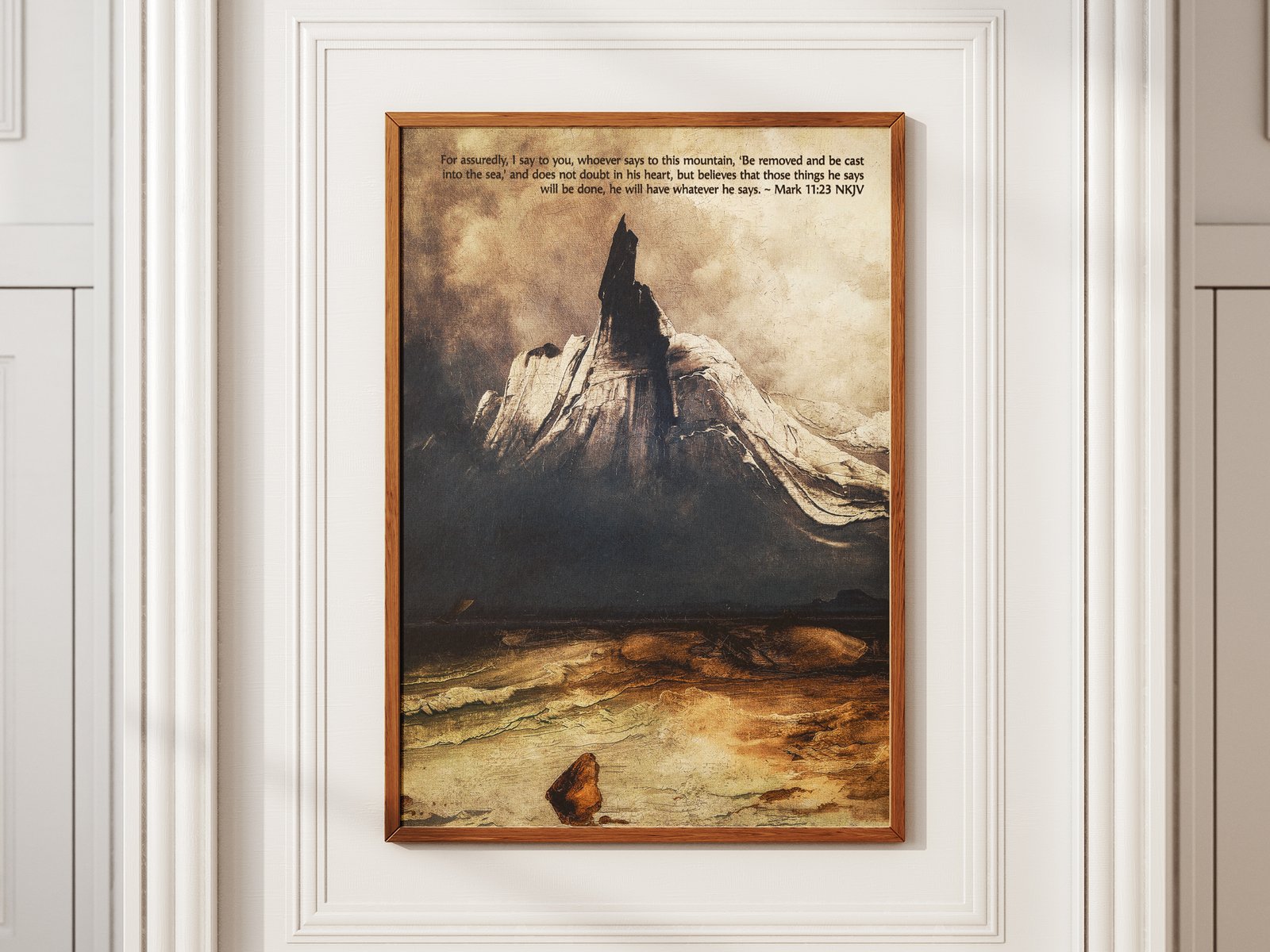 This vintage digital art print features Peder Balke’s Stetind in the Fog, an atmospheric depiction of a foggy mountain overlooking the sea. Paired with Mark 11:23, “Truly I tell you, if anyone says to this mountain, ‘Go, throw yourself into the sea,’ and does not doubt in their heart but believes that what they say will happen, it will be done for them,” this piece serves as a powerful reminder of unshakable faith and God’s strength. Perfect for Christian homes, pastor’s offices, or thoughtful gifts for men.