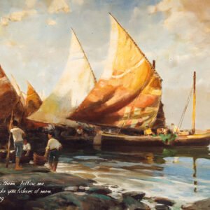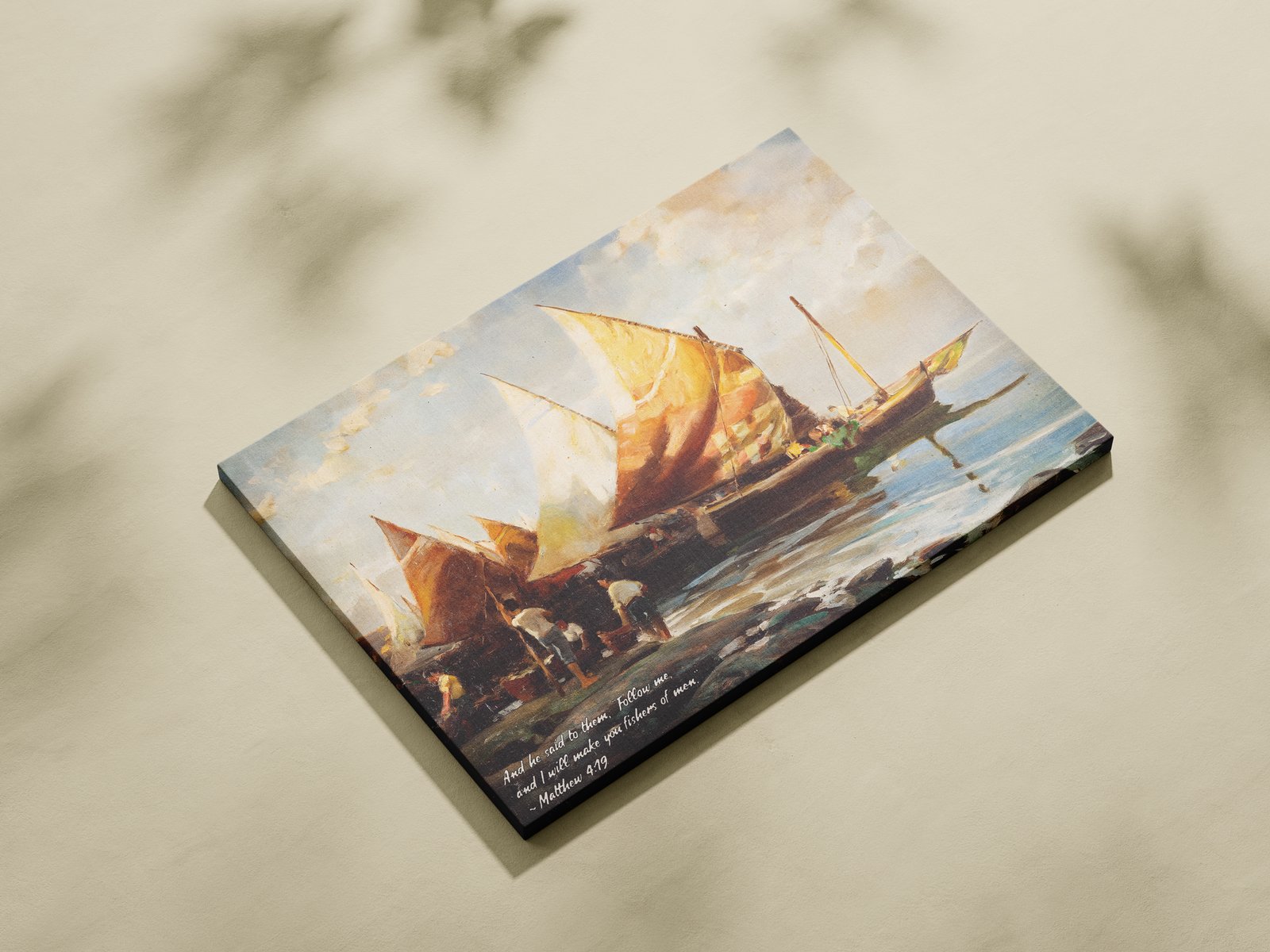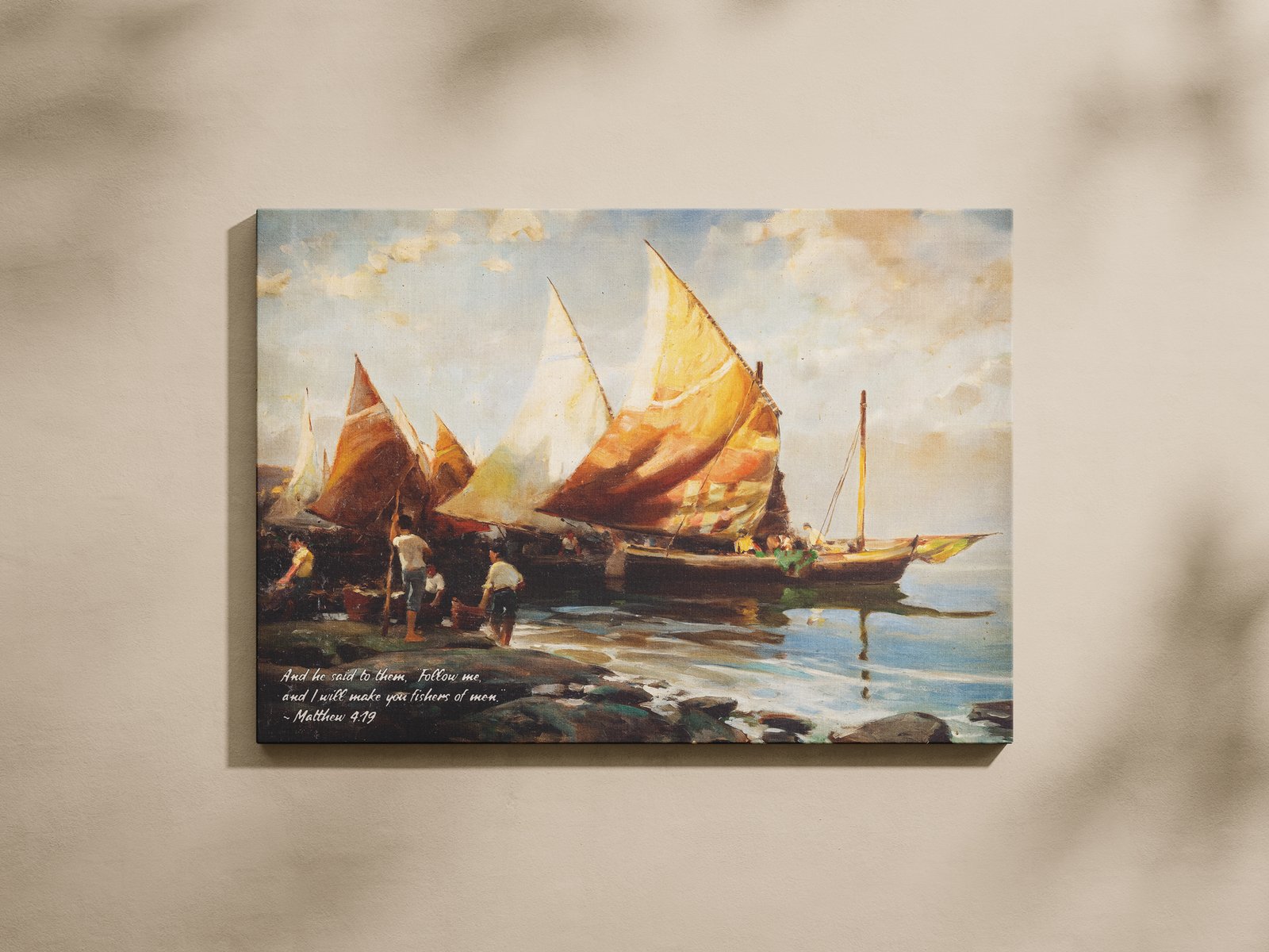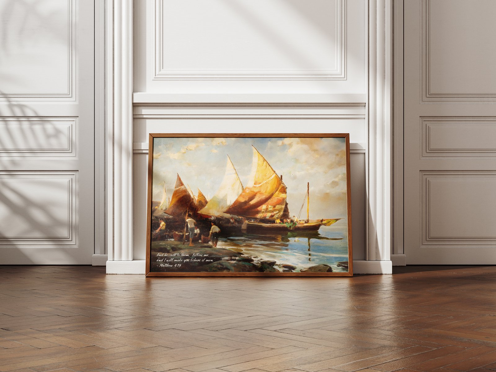 Matthew 4:19 “Fishers of Men” Christian Wall Art Bible Verse Art Vintage Fishing Boats Print Christian Wall Decor
