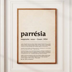 This striking digital print displays “Parrésia,” the Greek word for “BOLDNESS” in a dictionary-inspired style. Choose between a vintage or white background to suit any decor. Perfect for inspiring strength, this piece complements Christian homes, pastoral offices, and faith-based spaces.
