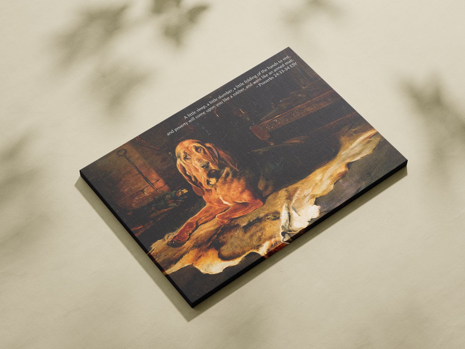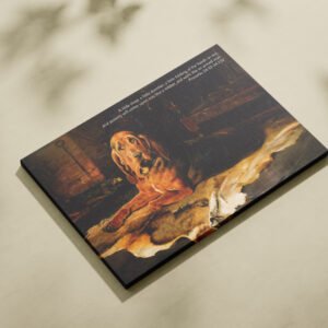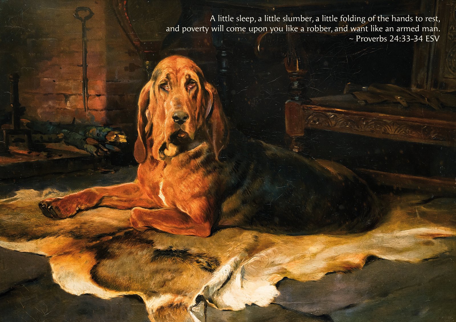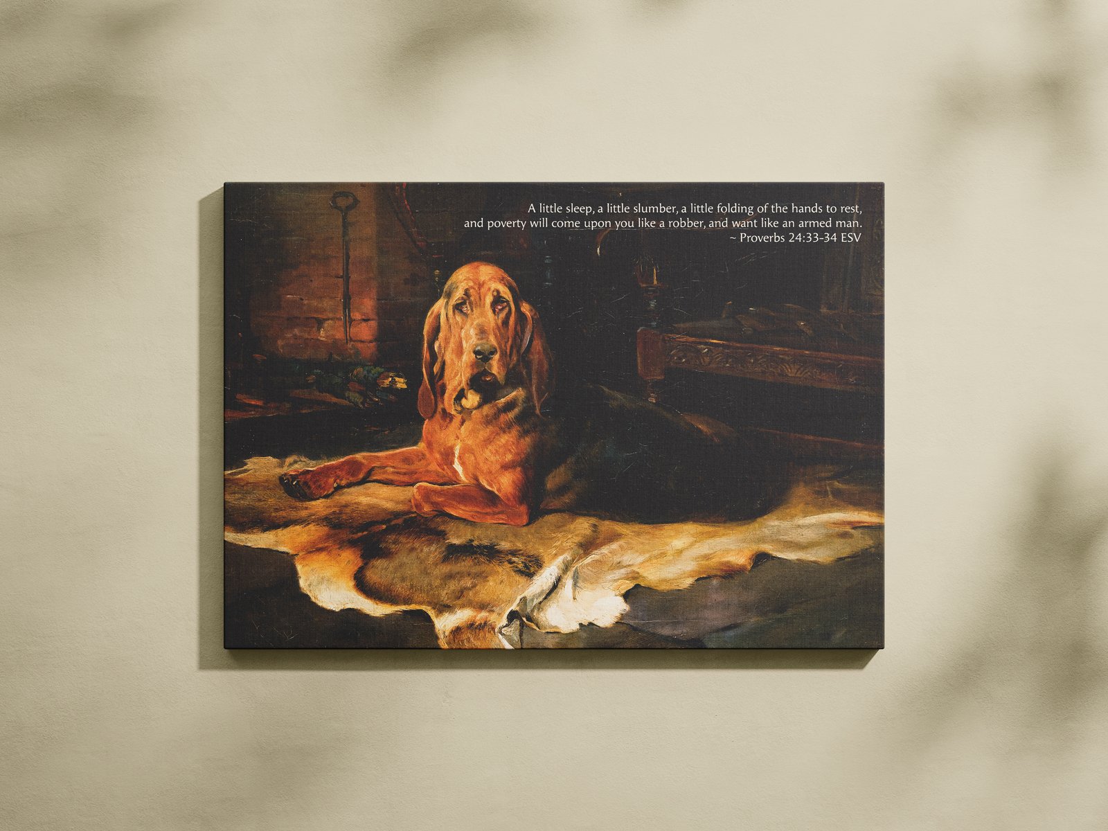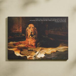 Showcasing the cozy charm of A Bloodhound by the Fireside by William Woodhouse, this digital art print combines moody vintage style with the powerful message of Proverbs 24:33-34. The piece speaks to the balance between rest and diligence, making it an ideal decor item for men’s spaces or Christian households.