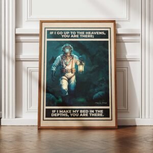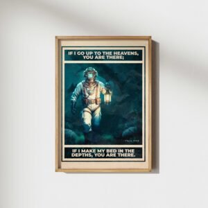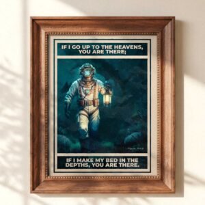 Step into the depths of faith with this vintage-inspired illustration of a diver walking the ocean floor, paired with the timeless words of Psalm 139:8 — “If I go up to the heavens, You are there; if I make my bed in the depths, You are there.”