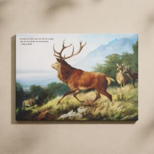 This vintage digital art print of A Deer Leaping in the Mountains by Carl Friedrich Deiker beautifully pairs with Psalm 18:33: “He makes my feet like the feet of a deer; He causes me to stand on the heights.” The verse speaks of agility and strength in God, perfect for encouraging moments of faith. Ideal for Christian homes, pastor’s gifts, or men’s decor.