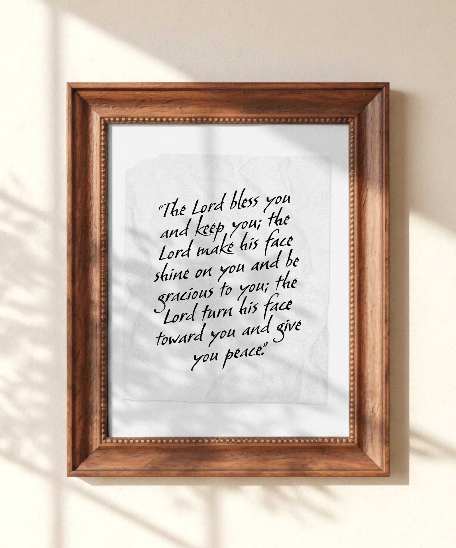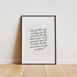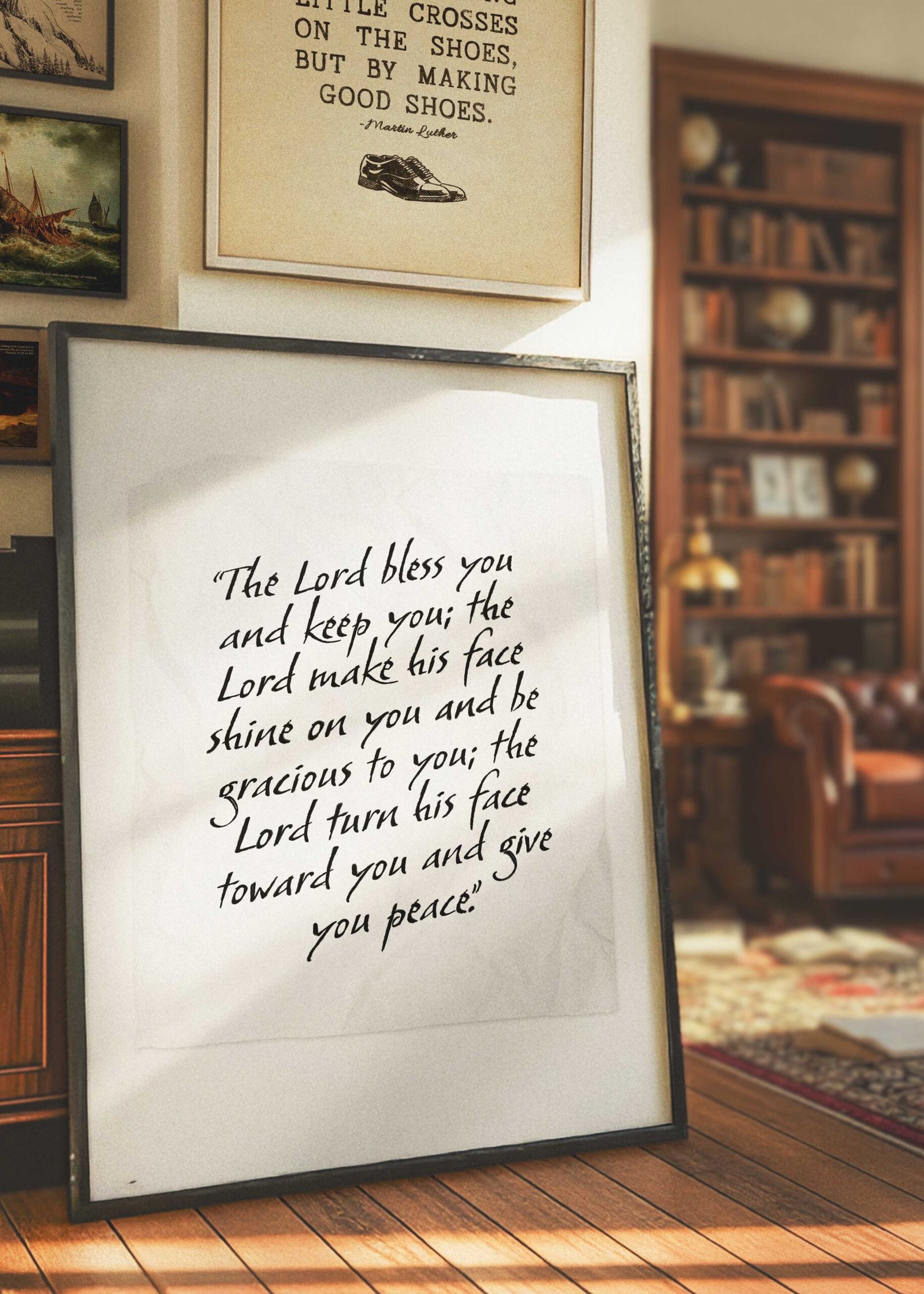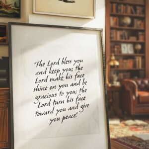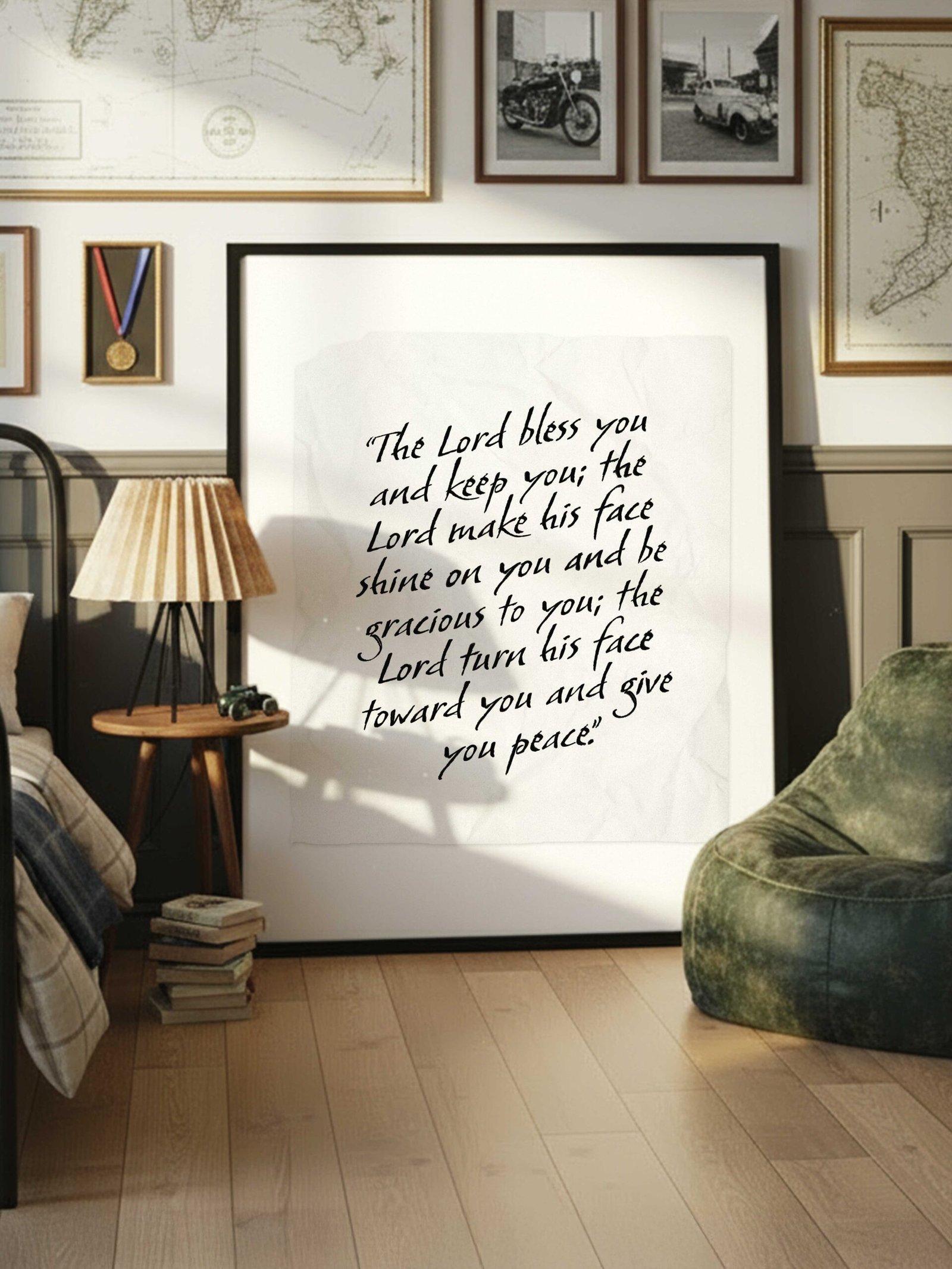 This Bible verse wall art features the Bible verse Numbers 6:24–26 — “The Lord bless you and keep you; the Lord make his face shine on you and be gracious to you; the Lord turn his face toward you and give you peace.” This printable highlights a vintage photograph of a the blessing on a handwritten note in a HDR Fine Art Photography style, perfect for vintage aesthetic interiors and masculine spaces alike. Serving as a daily reminder of God’s peace and protection, this print makes a heartfelt Christian gift for men, ideal for a husband, boyfriend, son, or pastor.
